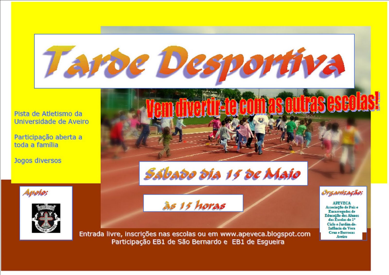 À semelhança do ano anterior a APEVECA vai realizar a Tarde Desportiva, no dia 15 de Maio, pelas 15h30 na Pista de Atletismo da Universidade de Aveiro, aberta a todos os alunos e seus familiares.