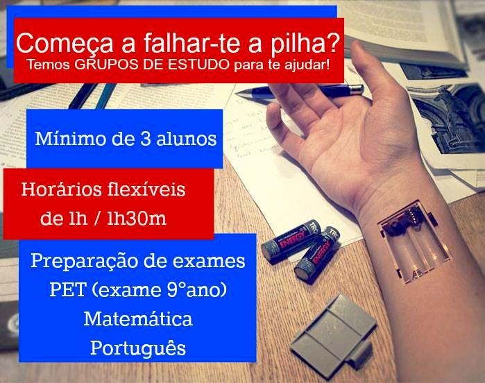 GRUPOS DE ESTUDO - Inscrições abertas (gratuitas) Preços entre 6€ a 7.5€ por hora Turmas com o máximo de 6 alunos Preparação para exames (PET/Português/Matemática) Para mais informações, contactar a secretaria