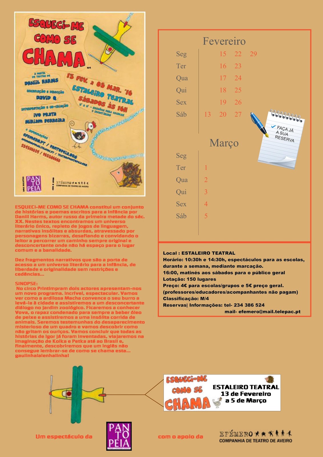 A Pantopeia, com o apoio da Efémero-CTA, leva à cena no Estaleiro Teatral a peça para a infância ESQUECI-ME COMO SE CHAMA, concebida a partir de um conjunto de histórias e poemas escritos para a infância por Daniil Harms, autor russo da primeira metade do séc. XX.